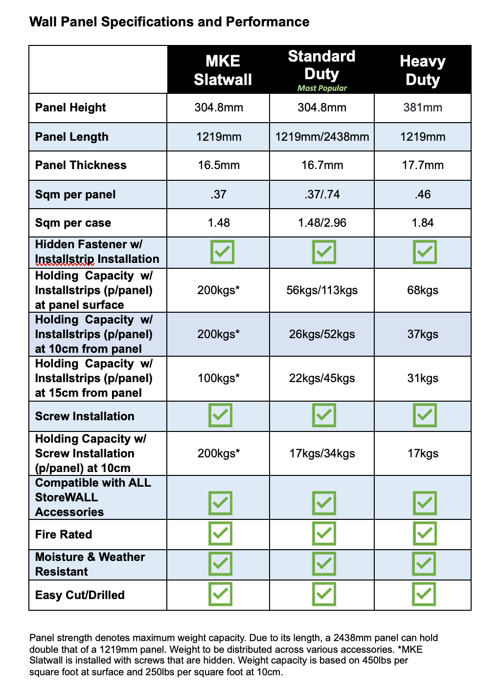 - Strength: 1219mm panel – Supports 68kg at the Panel Surface, 37kg at 10cm from the Panel Surface, and 31kg at 15cm from the Panel Surface.